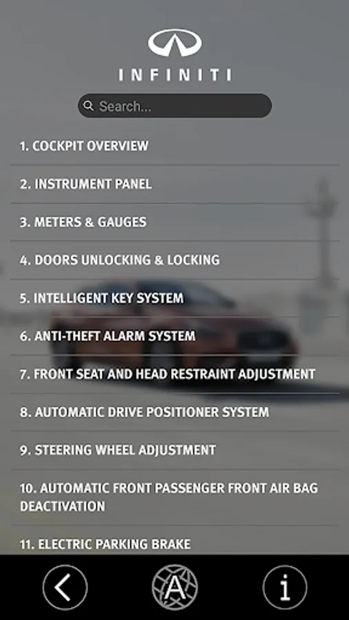The INFINITI Driver’s Guide is an application based on Augmented Reality Technology. It will help you to learn and understand more about your vehicle.