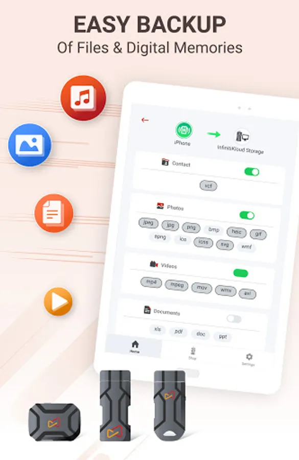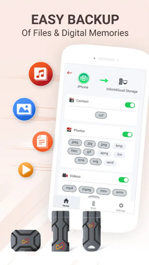 Your wireless storage is endless with InfinitiKloud. The app helps you save all of your photos, including personal images, animated photos, and icon files, as well as videos in the most popular formats such as MP4, MVW, Avi, QuickTime, and MPEG.