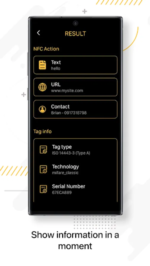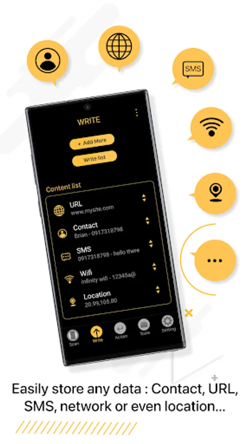 π Easily store any data: Contact, URL, SMS, network or even a location,...