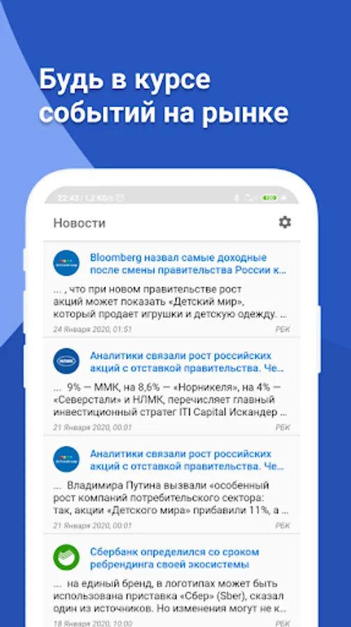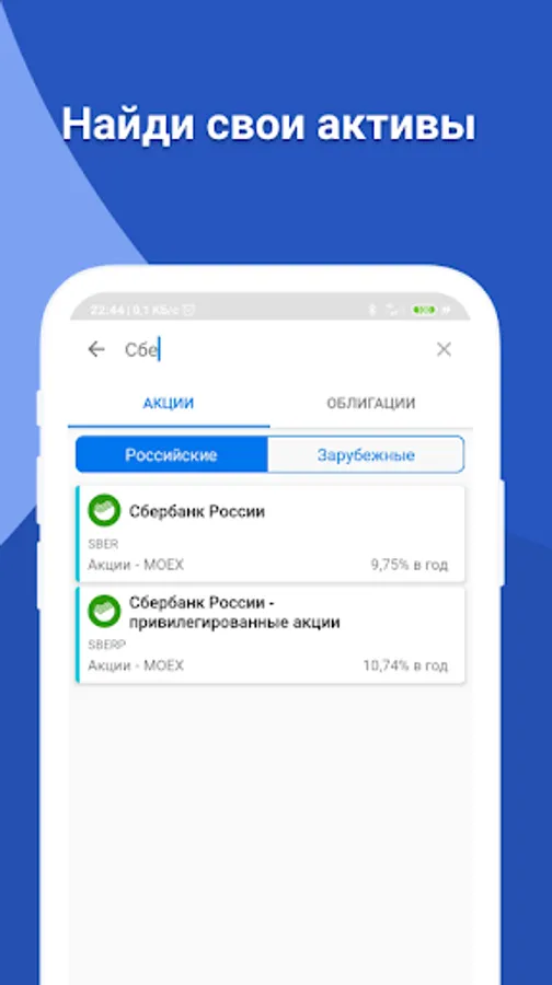 In the application you can find more than 5,000 shares and bonds traded both on the Russian market - the Moscow Exchange, St. Petersburg Exchange, and on the foreign market - NASDAQ, NYSE exchanges. We are constantly working on adding new securities and exchanges to our application!