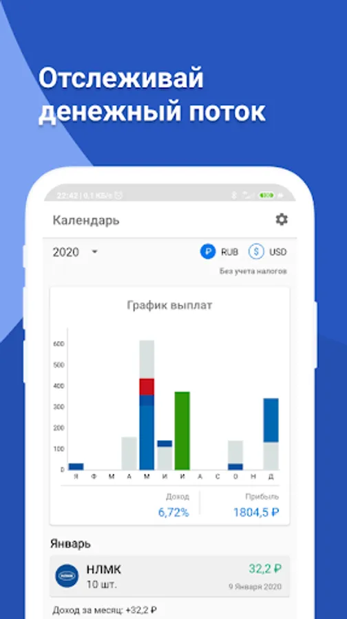 Now you can receive information on dividends in the form of a convenient schedule and list that visually visualize your passive income. You can customize past payments so that we can more accurately analyze dividend income. The cost of securities is updated daily, so you will always receive only relevant information about your income.