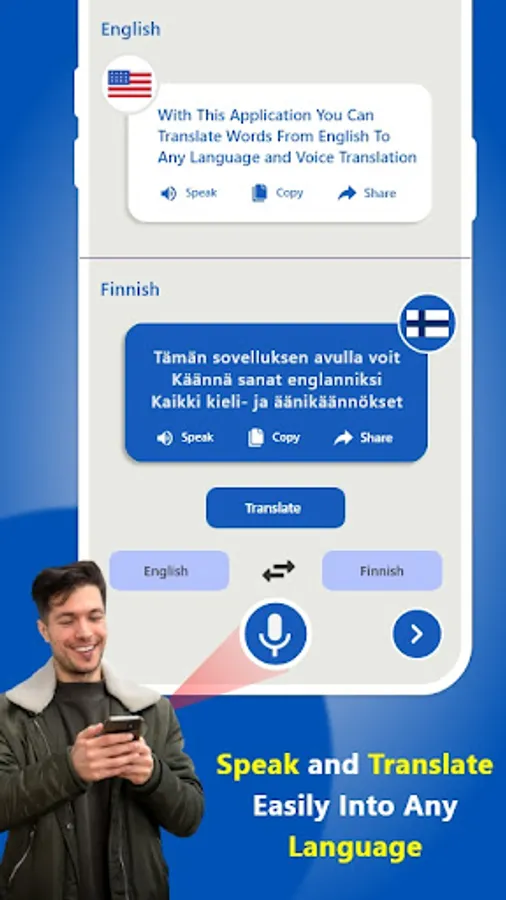 Use Native Keyboards for Finnish Translator and translate your Complete Message into English. Don’t hesitate to speak to anyone if you don’t know their language Simple Download our app Start Communicating.