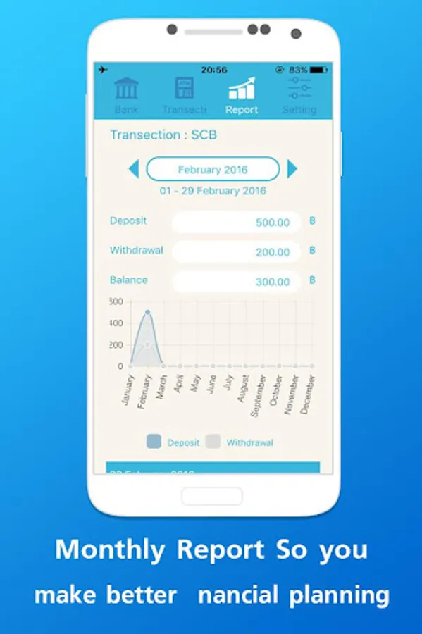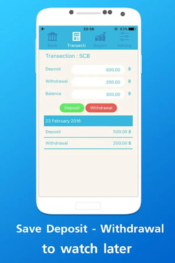 This application will help you know where is your money going or coming. And help remember your bank account and money in it. Very easy to use just note when you use deposit or withdraw money. Open application and enter your money depends on you. You can view graph of you money daily. That will help you know your bank account and amount. And the last you will save you money and grow up them. If you have any problem please feel free to contact us.