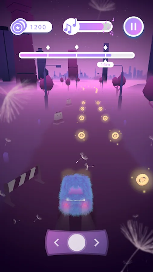You have to grab the musical notes because they're your fuel and you want to keep listening to the relaxing song. If you crash into obstacles, you'll lose fuel. So be careful with your fluffy fur car!