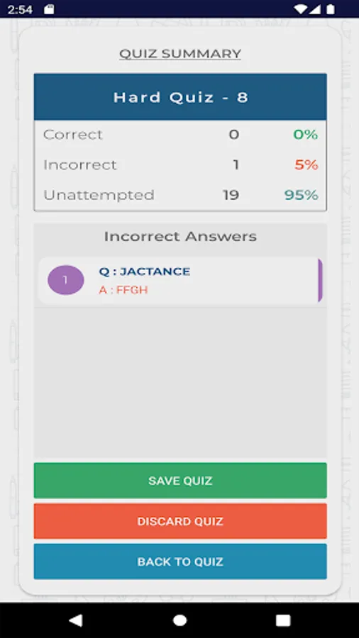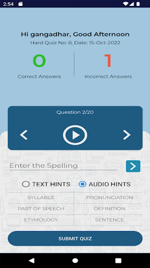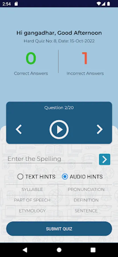 User can retake the quiz from where they left off or clear the quiz and take from the beginning (Next release will offer the option to take the quiz with only missed words)