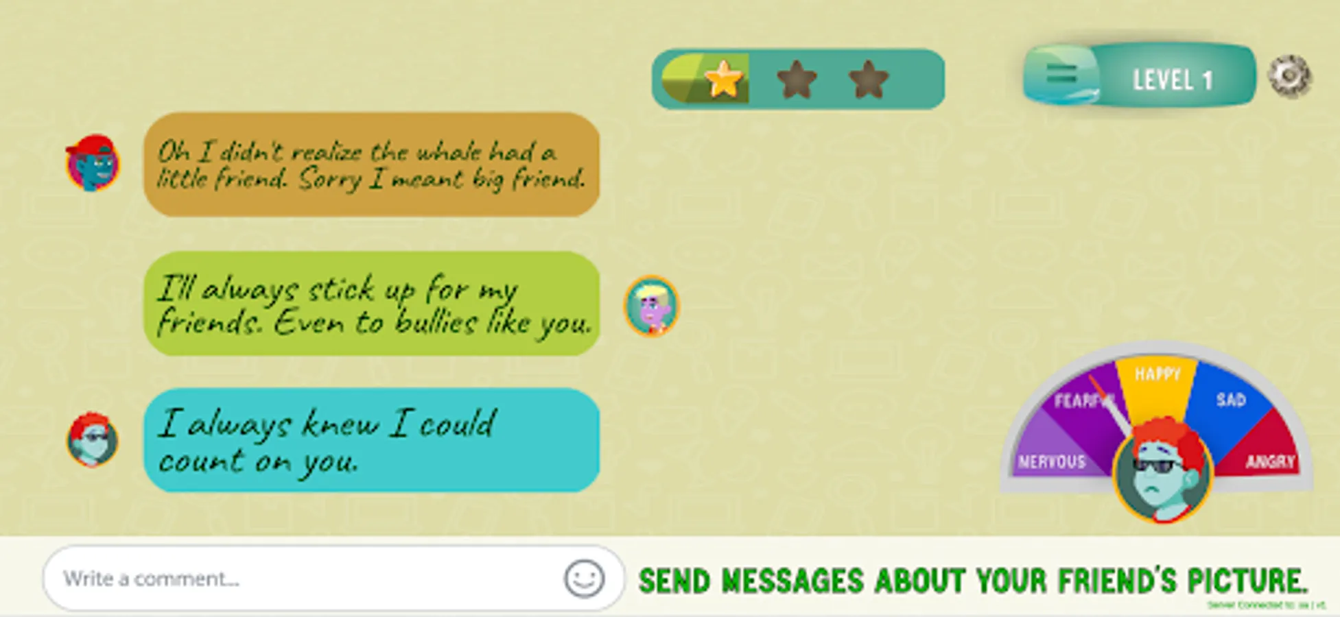 Our app is a free, fun and educational way for users to learn on real life situations and problem-solve them. Players will learn about cyberbullying, restorative justice, teambuilding, negotiation, peer mediation, and more by playing the games and simulations featured in the app. No background knowledge on these topics is needed for playing.
