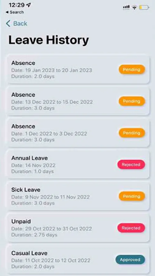 Leave Balance & History - View history of all your applied leaves along with their Approval status.