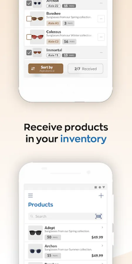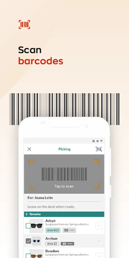 Use the built-in camera to receive new stock as it arrives. Scan items mark them as shipped. No extra equipment required.