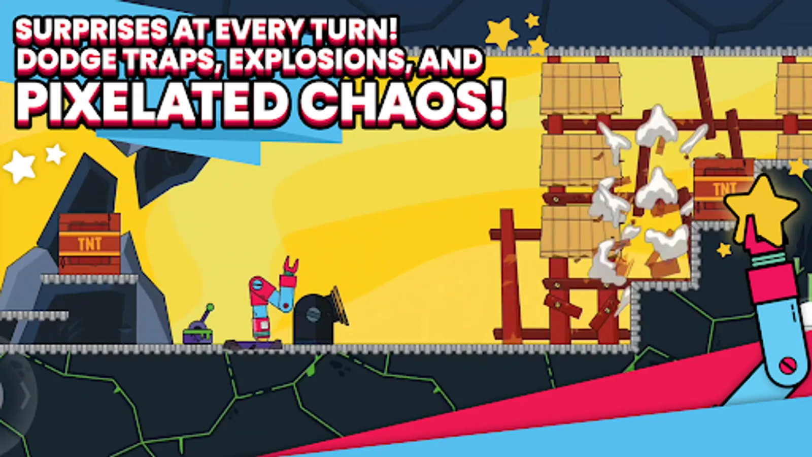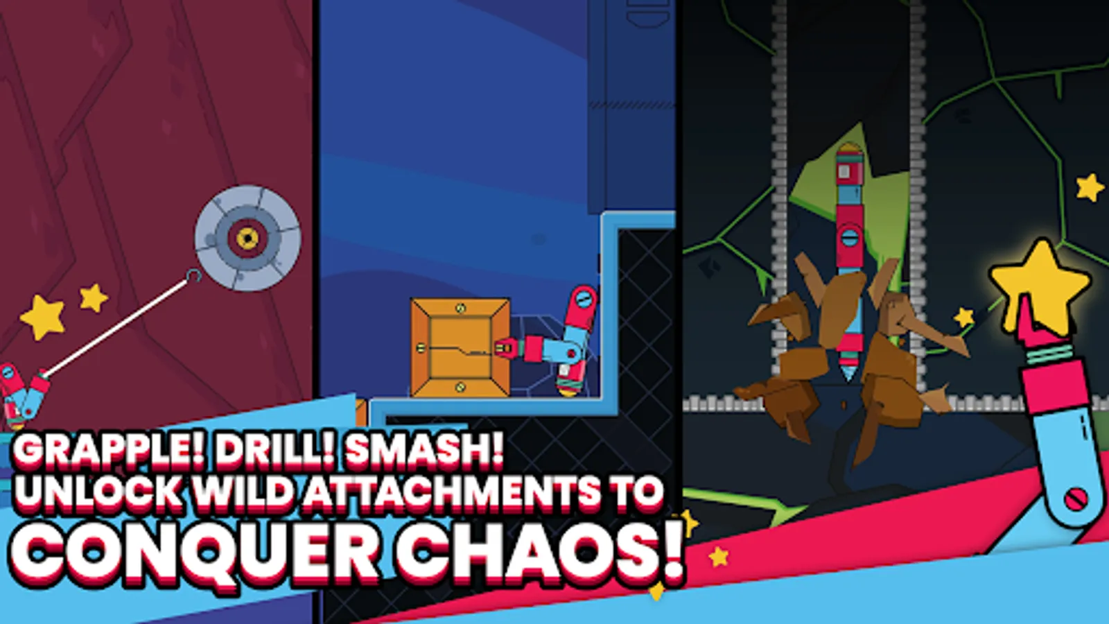 Who needs boring weapons when you can switch between a grappling hook, a power drill, and a claw straight out of an arcade machine? Smash, grab, and drill your way through obstacles with questionable safety regulations!