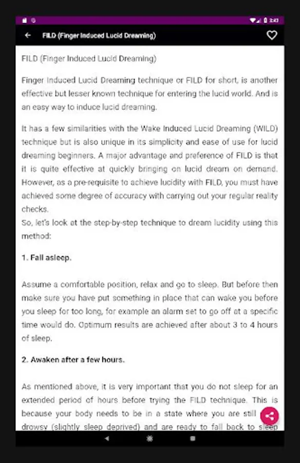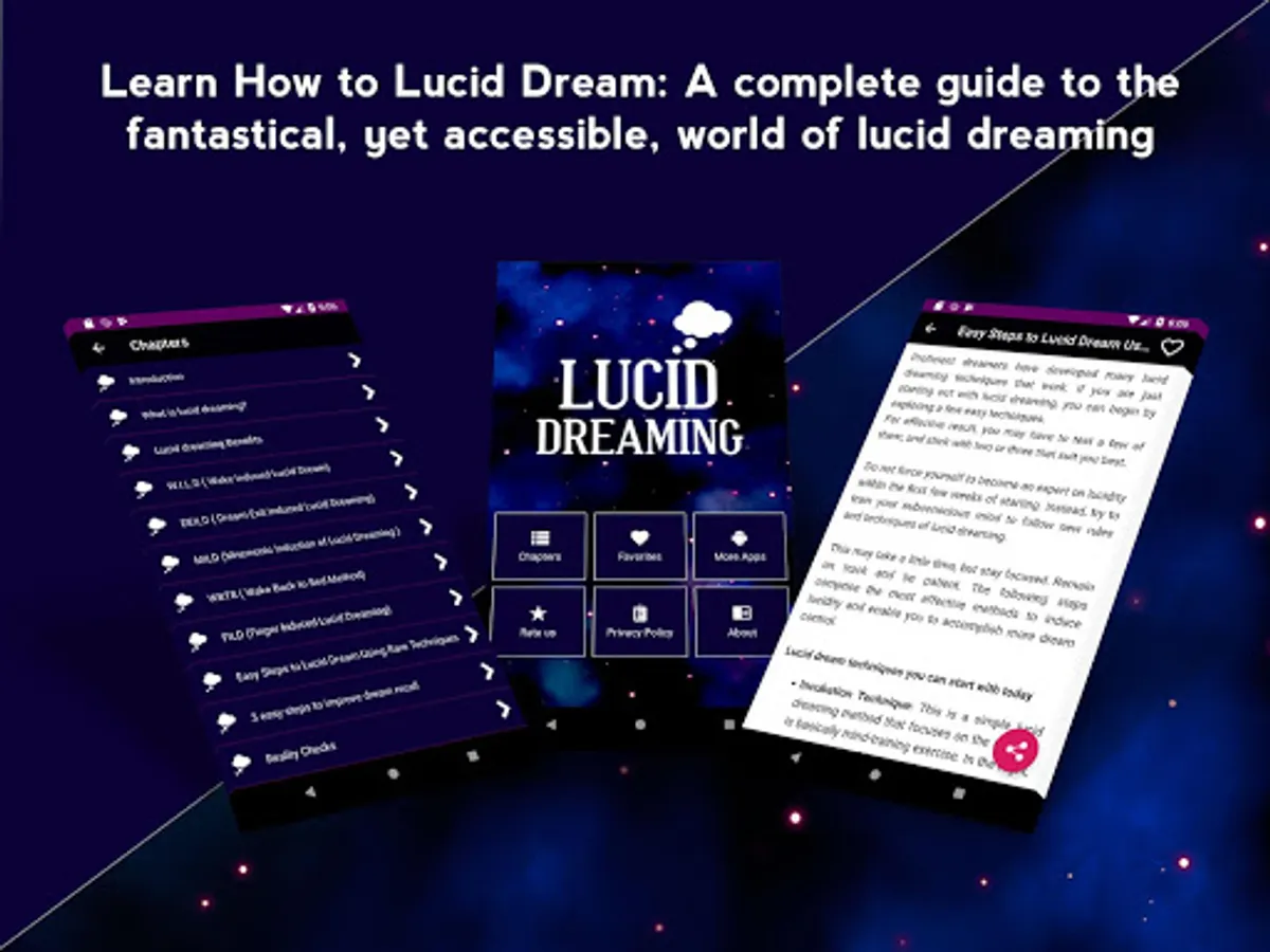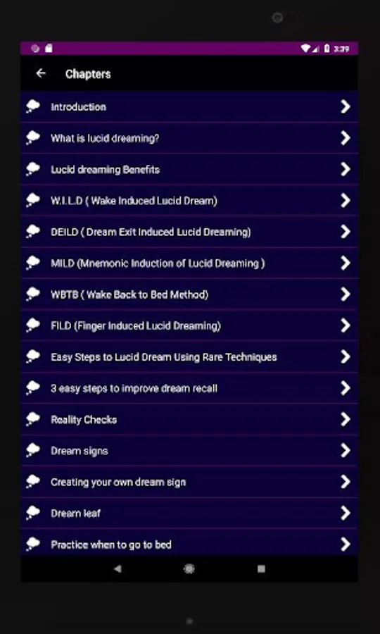 It really isn't that difficult to learn. And you can expect to see results in just a few weeks In the following few chapters we will look at some common lucid dreaming techniques. There isn't a one technique suits all when it comes to lucid dreaming. Some techniques don't suit everyone for instance the WBTB method would be a little tricky if you have to get up early in the morning for work and family commitments. We will cover MILD, WILD, WBTB, FILD AND DEILD along with some of the problems you might face. So that you can work out which one suits you best. So let's get started by downloading this app.