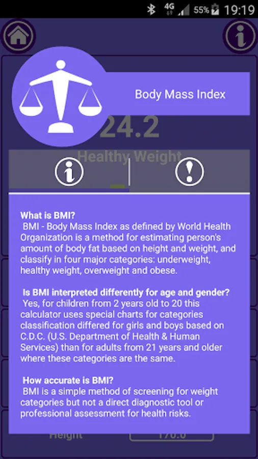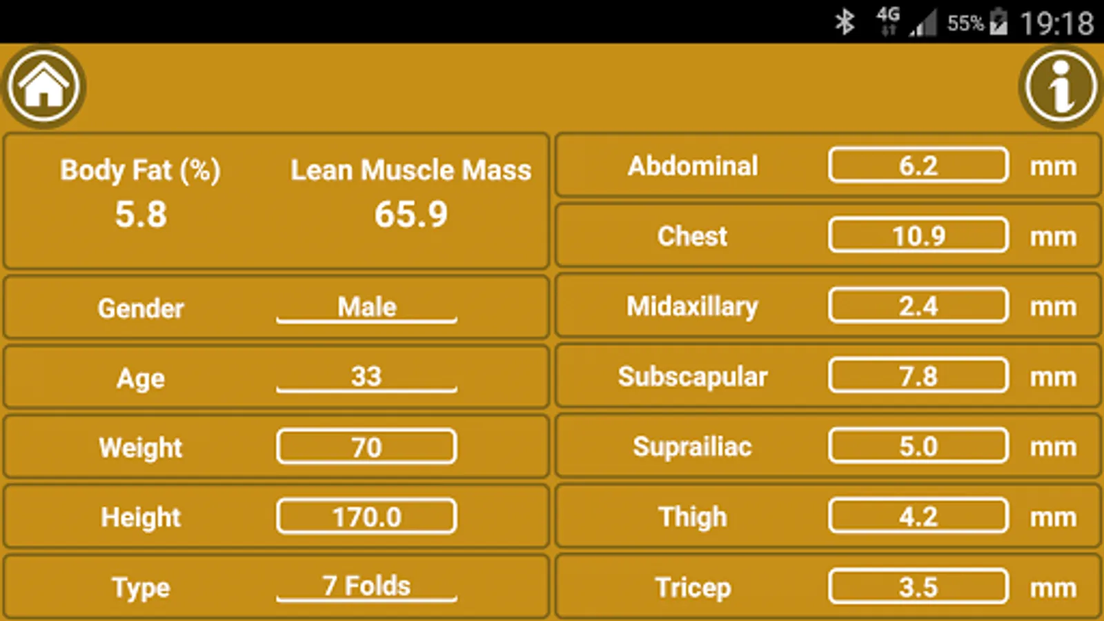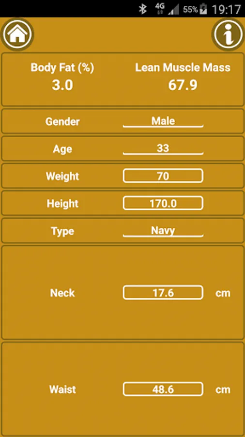 Calculate your BMI (body mass index), calculate body fat percent and lean muscle mass using caliper or tape, estimate daily calorie needs (BMR) and a desired heart rate for a workout. Make a quantitative mark of your fitness shape. Analyze your body health and performance, get fit and be healthy.