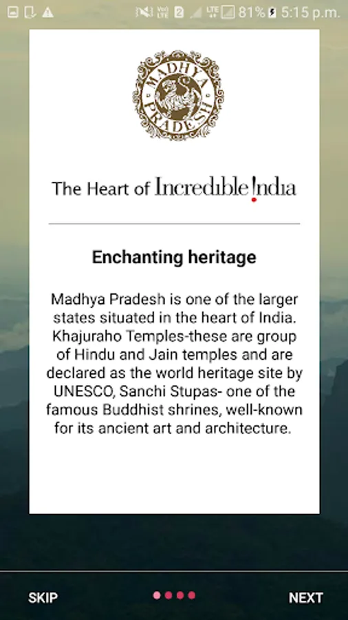 It brings the complete Madhya Pradesh - The heart of incredible India at your fingertips. This makes you feel native to the places even before actually visiting it.The App covers all scenic sites, heritage places and religious sites of all cities like Indore, Bhopal, Ujjain, Ammarkantak etc.