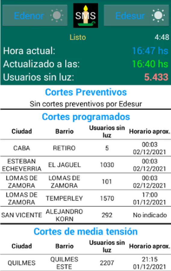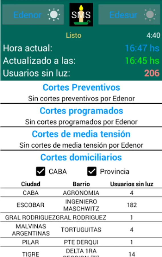 Indicating Cities and Neighborhoods, number of users without electricity and approximate hours of reestablishment.