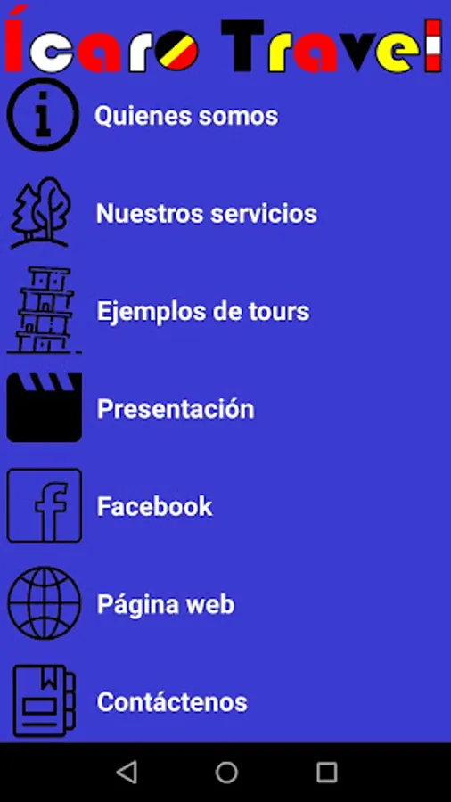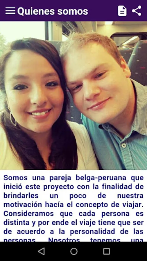 This application is for people who want to travel to Europe using our services. In this application we explain who we are, what our services are and we offer the explanation of some exemplary tours. In addition to this, you will have the option to see a presentation of our travel agency and you can enter our Facebook and website.