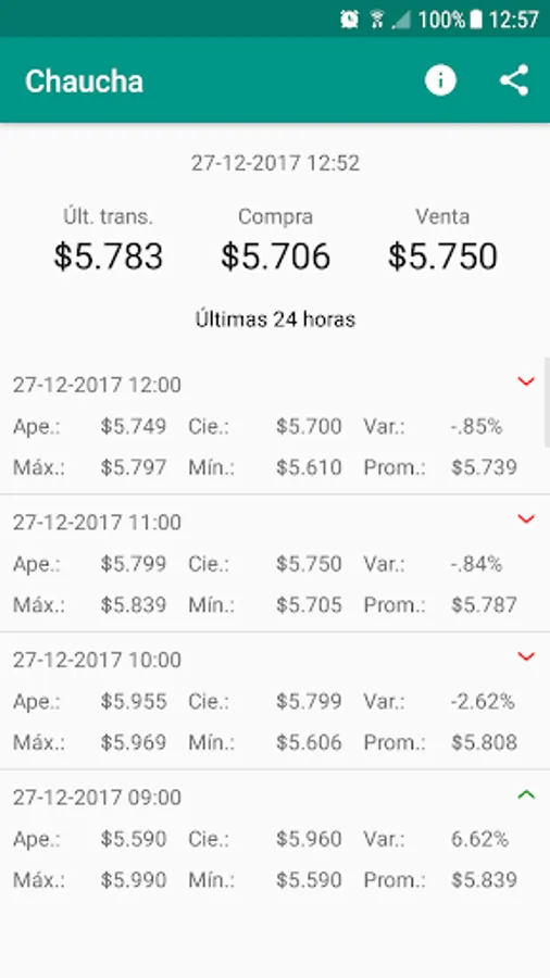 Information of the last 24 hours on the opening, closing, variation, maximum, minimum and average value of each hour.
