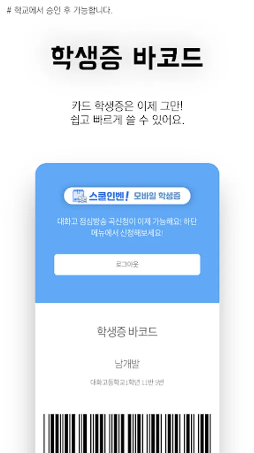 -Student ID barcodes require student council approval. After approval, please contact us through the contact number below (Junseo Nam), and we will quickly add schools.