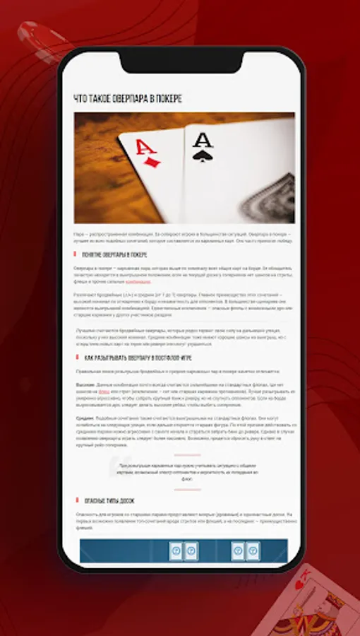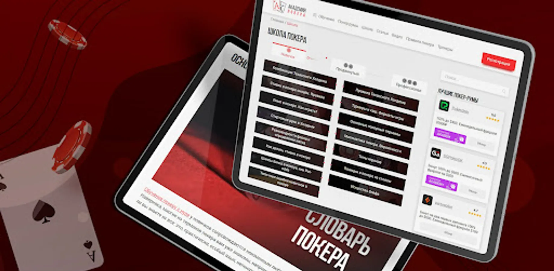 В приложении Академия покера вы сможете найти десятки обучающих материалов. Новые игроки получат ценную информацию о правилах, комбинациях, а также стартовых стратегиях. Для тех, кто уже сделал первые шаги в покере, есть статьи о действиях в разных позициях, рекомендациях игре по GTO, а также гайды по использованию популярных покерных программ.