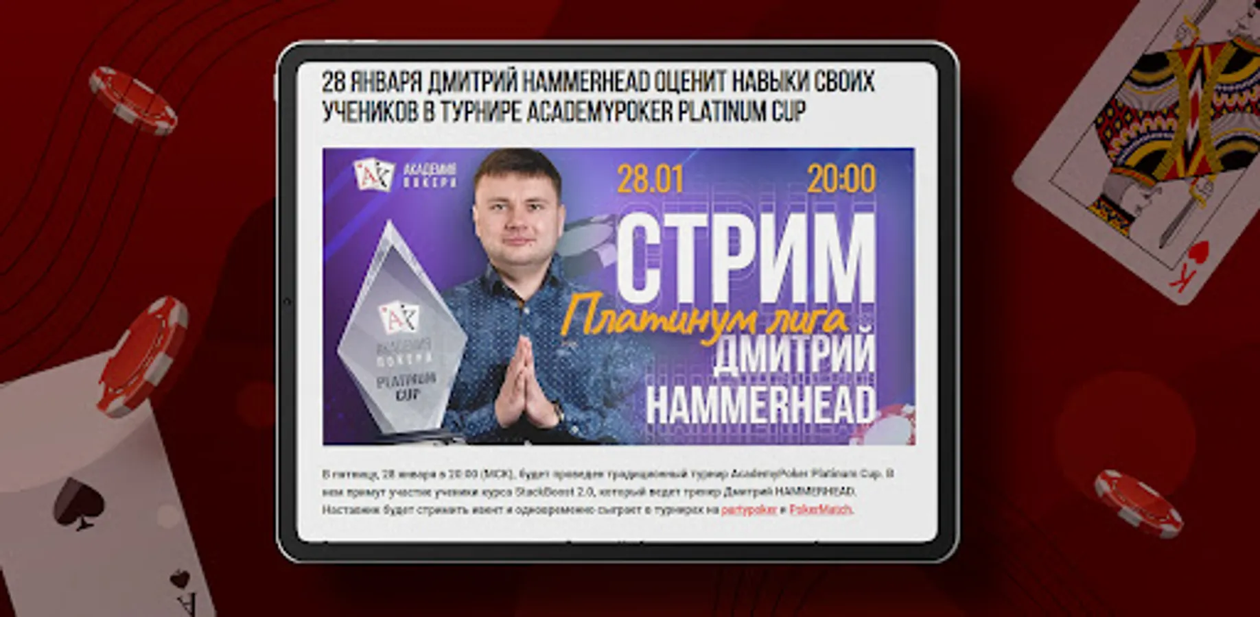 Тренеры «Академии покера» регулярно проводят стримы с различными розыгрышами, в которых подробно разбирают и комментируют свои действия. Это отличный наглядный материал для начинающих игроков, который может помочь прокачать игру. Стримы выходят регулярно, а пользователи смогут отслеживать их начало с помощью анонсов в приложении Академия покера.