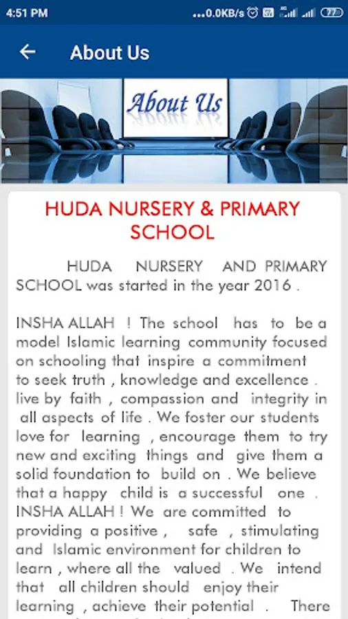 HUDA NURSERY AND PRIMARY SCHOOL provides attractive buildings, well- furnished classrooms, lab facilities, library facilities, etc.