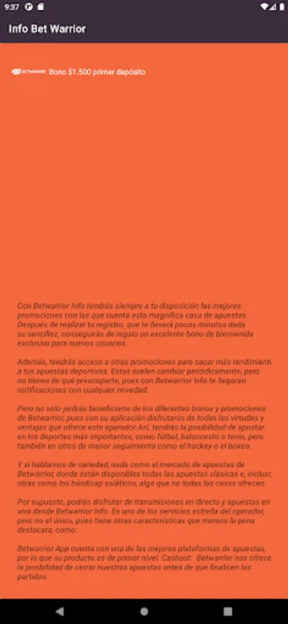 Download the App here and try it totally free, and receive our magnificent welcome bonus as a gift, with which you can start betting with free money. And it is one of the best on the market, since Betwarrior grants 100% of the first deposit up to a maximum of $1,500.