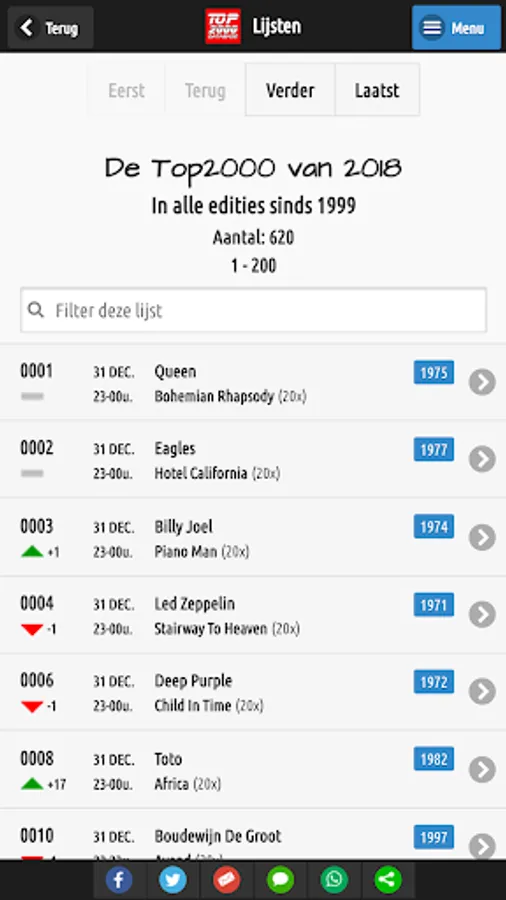 With the Top2000 Database app you have a complete overview of all editions of the Top 2000. View all editions, which records have (re) entered or disappeared, what are the risers and falls, etc.