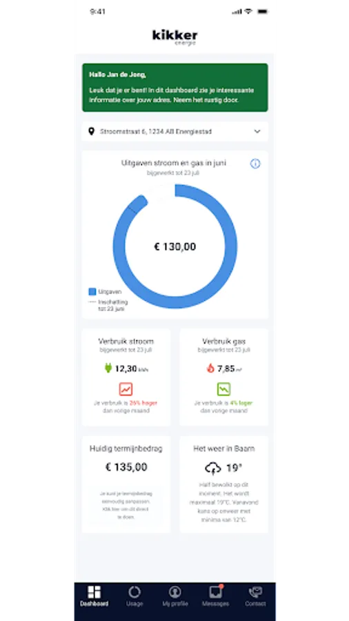 We give you insight into your energy usage and costs through interesting tools. In a clear dashboard, you can see exactly what your energy costs are and you can even compare this with our estimate. You can also see in detail (up to an hourly level) how much electricity and gas you have used and how expensive this was. Do you have multiple addresses? No problem, all your addresses are visible in the app.