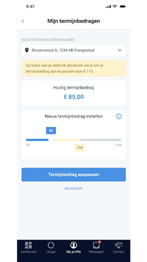 Do you want to view or change more information? In the app you will find all important information and you can adjust it immediately. Think of changing your monthly amount or contact details. Of course we also show all other data, such as your tariffs, bills and contract.