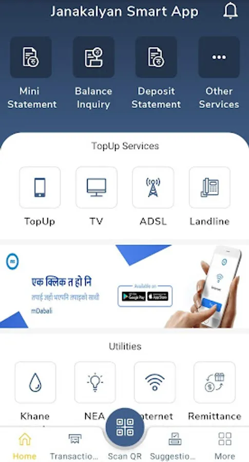 Janakalyan Smart App is an online payment mobile application developed for utility payment such as bill payment, recharge or top up of service providers like Nepal Telecom, Ncell and Dish Home along with mobile banking features.