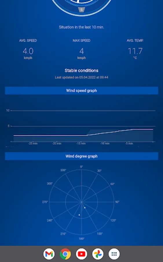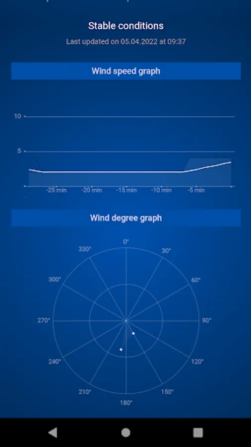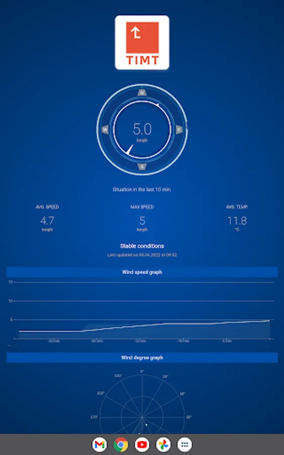 The "TIMT Italy Anemometer" application allows you to view in real time, with an update frequency of 10, the weather conditions, specifically the wind speed and direction, a graph representing the speed in the last 30 minutes and finally a graph showing the wind angle.