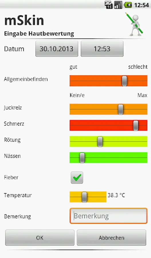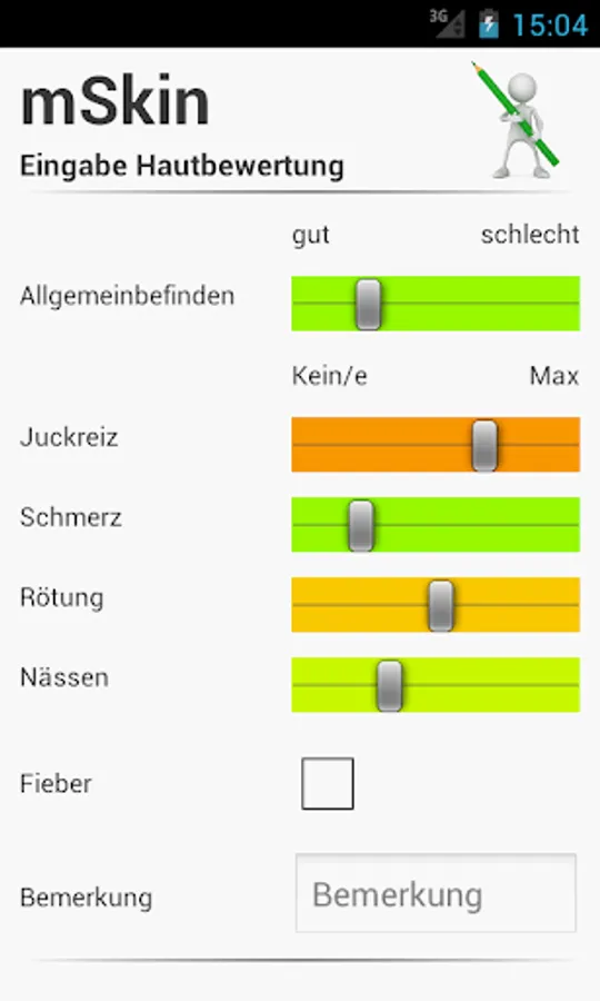 The main task of the mskin app is to take pictures of wounds or skin disorders and subjective fishery extension data, such as itching, redness, oozing, pain and fever, so that the healing process to document and ask your doctor the collected data.