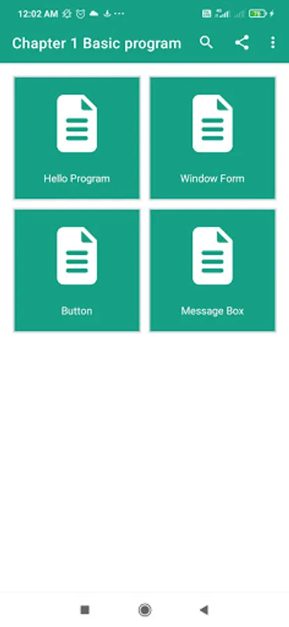Basic program,Variables,Conditional,Loop,Menu,Image and Dialogue box,.Net methods,Arrays,Collections,String Manipulation,Events,List comboBox ,Classes and Object,Files,Date and Time,Multiple Forms.