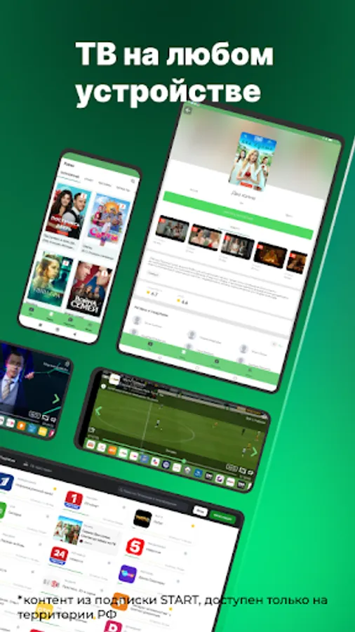330+ online TV channels for free - for everyone, anytime and anywhere (at least in the territory of the Russian Federation). STS Lyubov, TNT (and TNT Premier), MUZ TV, REN TV, NTV (and NTV Plus), OTR, TV-3, TVC, Russia 1, Russia 2, Russia 24, Russia-Culture, Mir, First Channel 1, Channel Five, Che, Match TV, Zvezda, Friday, Carousel, Home, Bridge TV, Yu, 2x2, Moscow 24.