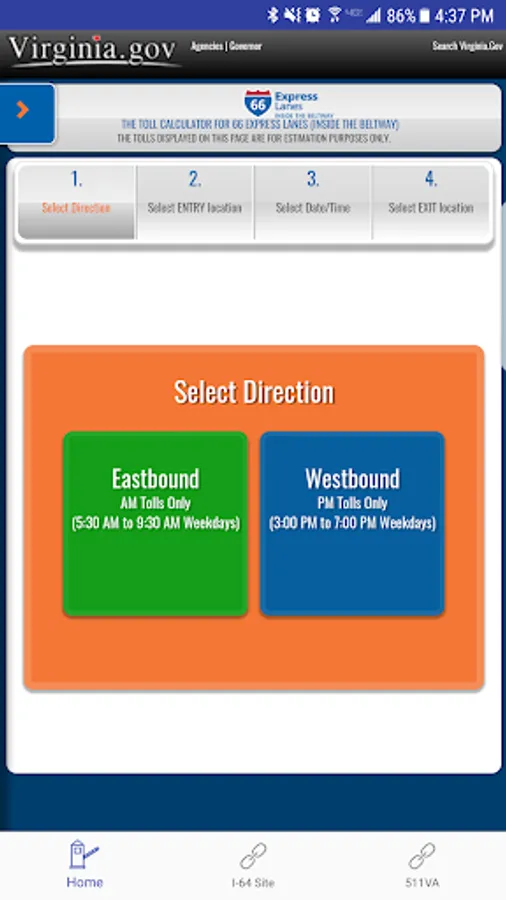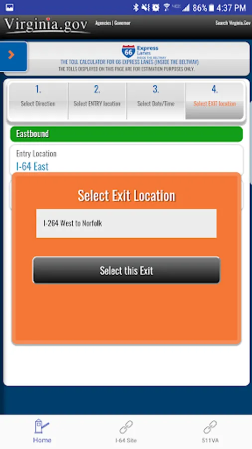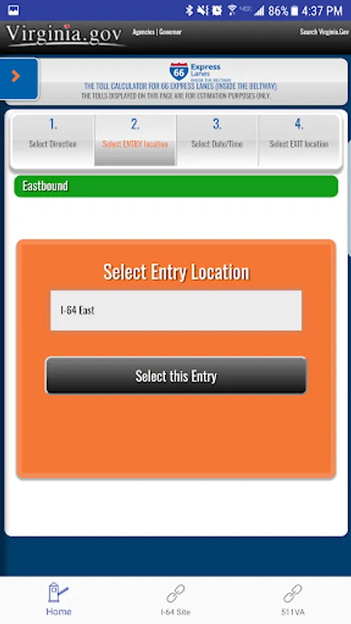 Through a simple calculator-style interface, users must select their direction of travel, their entrance point onto the 64 Express Lanes, date and time of entry, and their exit point off the 64 Express Lanes. The app will display the estimated toll for the trip. The app provides historical toll prices, up to and including current toll estimates.