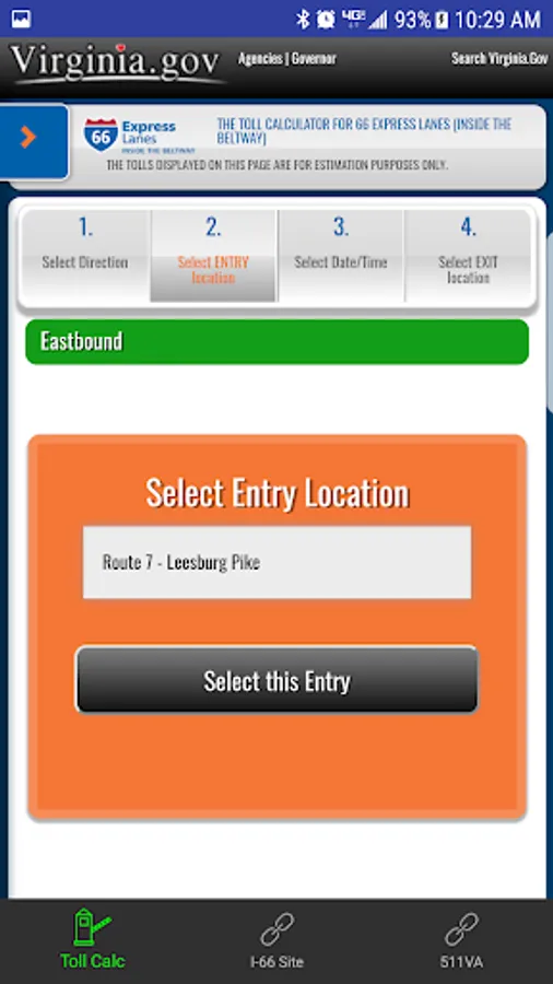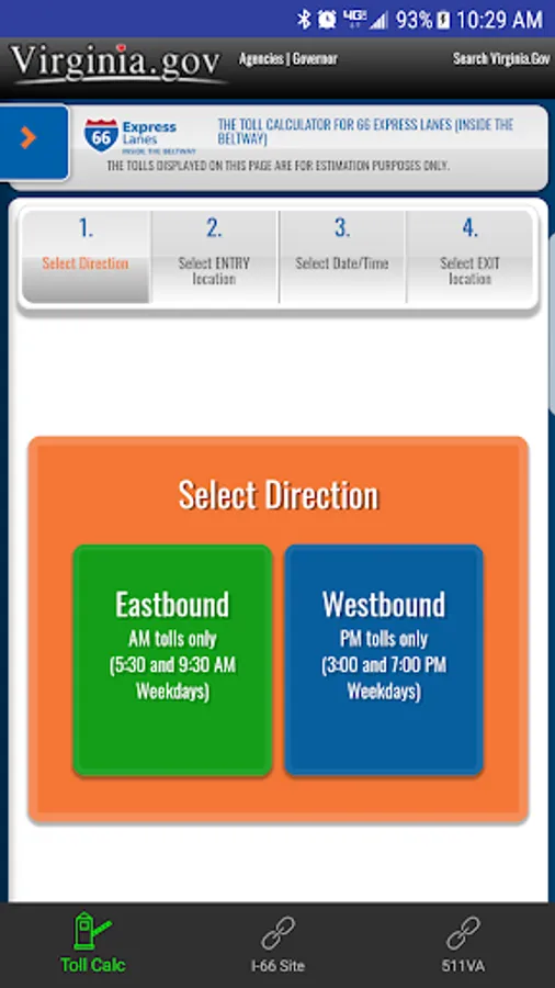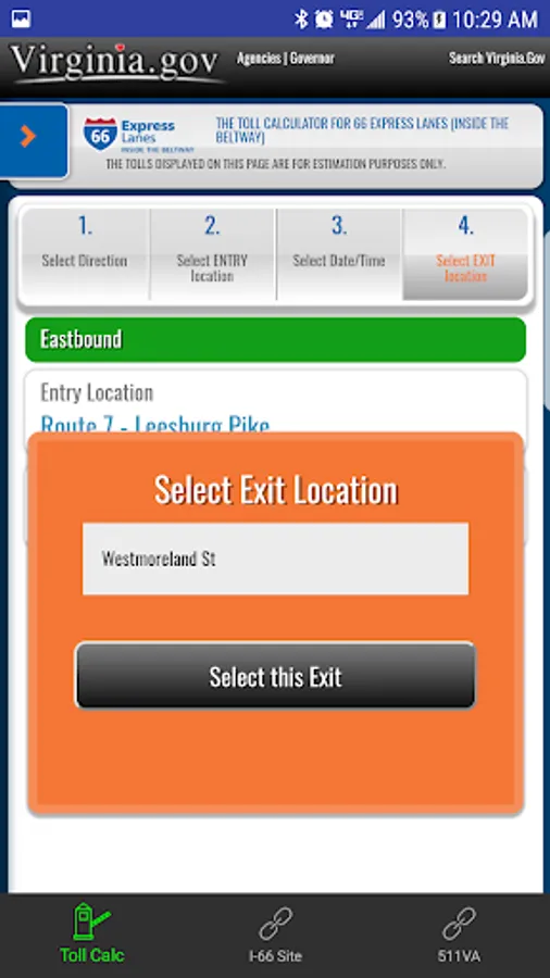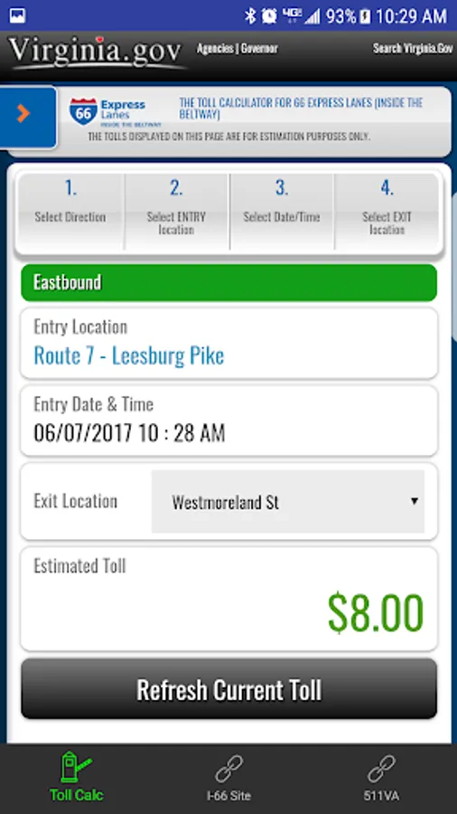Through a simple calculator-style interface, users must select their direction of travel, their entrance point onto the I-66 Express Lanes, date and time of entry, and their exit point off the I-66 Express Lanes. The app will display the estimated toll for the trip. The app provides historical toll prices, up to and including current toll estimates.
