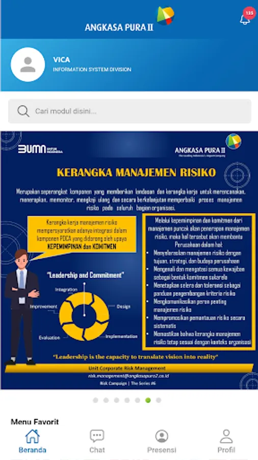 Application internal portal PT Angkasa Pura II (Persero), an application used to manage the activities / internal activity of the Company, in which there is information that can be accessed by employees, such as: Information Personnel, Commercial, Finance, Operations, Social Media Corporate and others, as well as can manage the operational activities undertaken by the Group or Business Partner.
