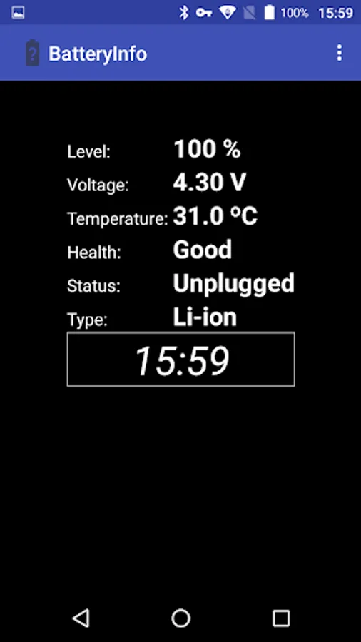 Displays: Battery Level, Voltage, Temperature, Battery Health and Battery Type. Useful for monitoring your battery.