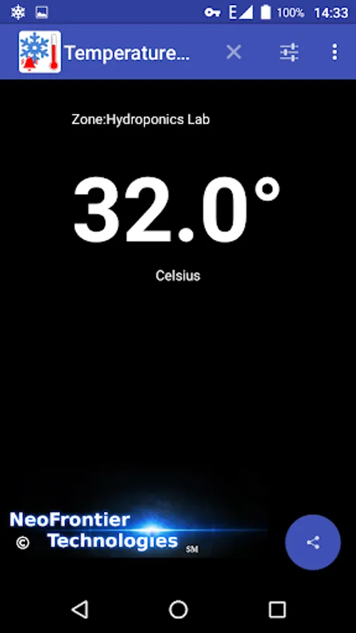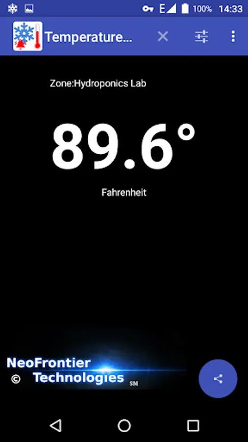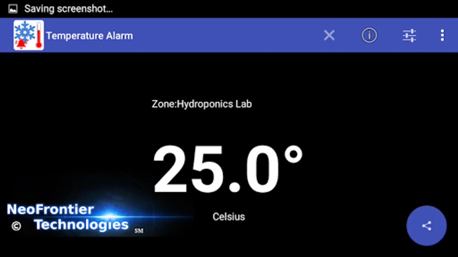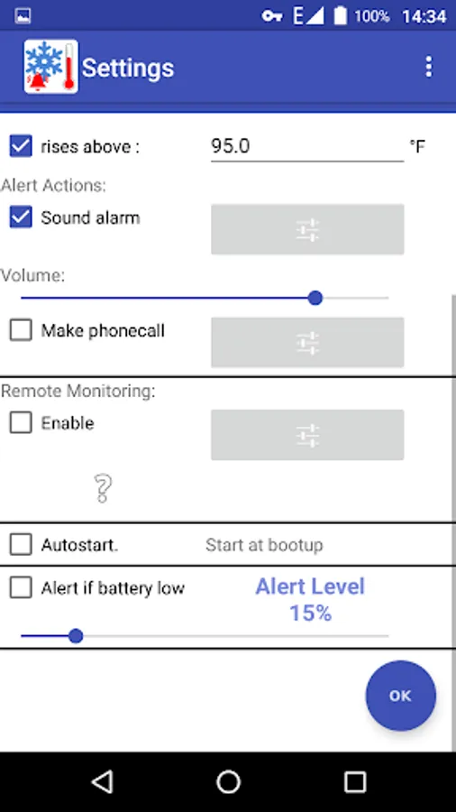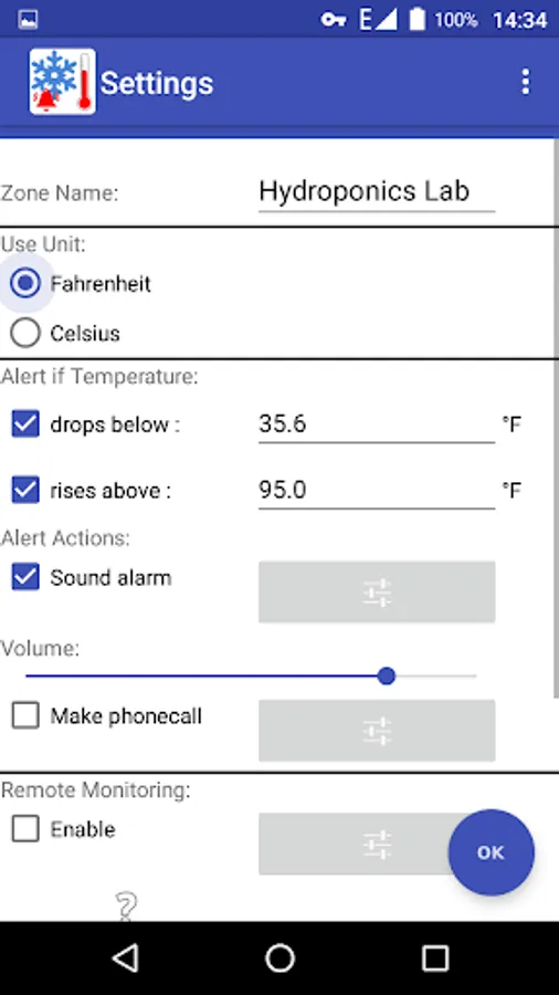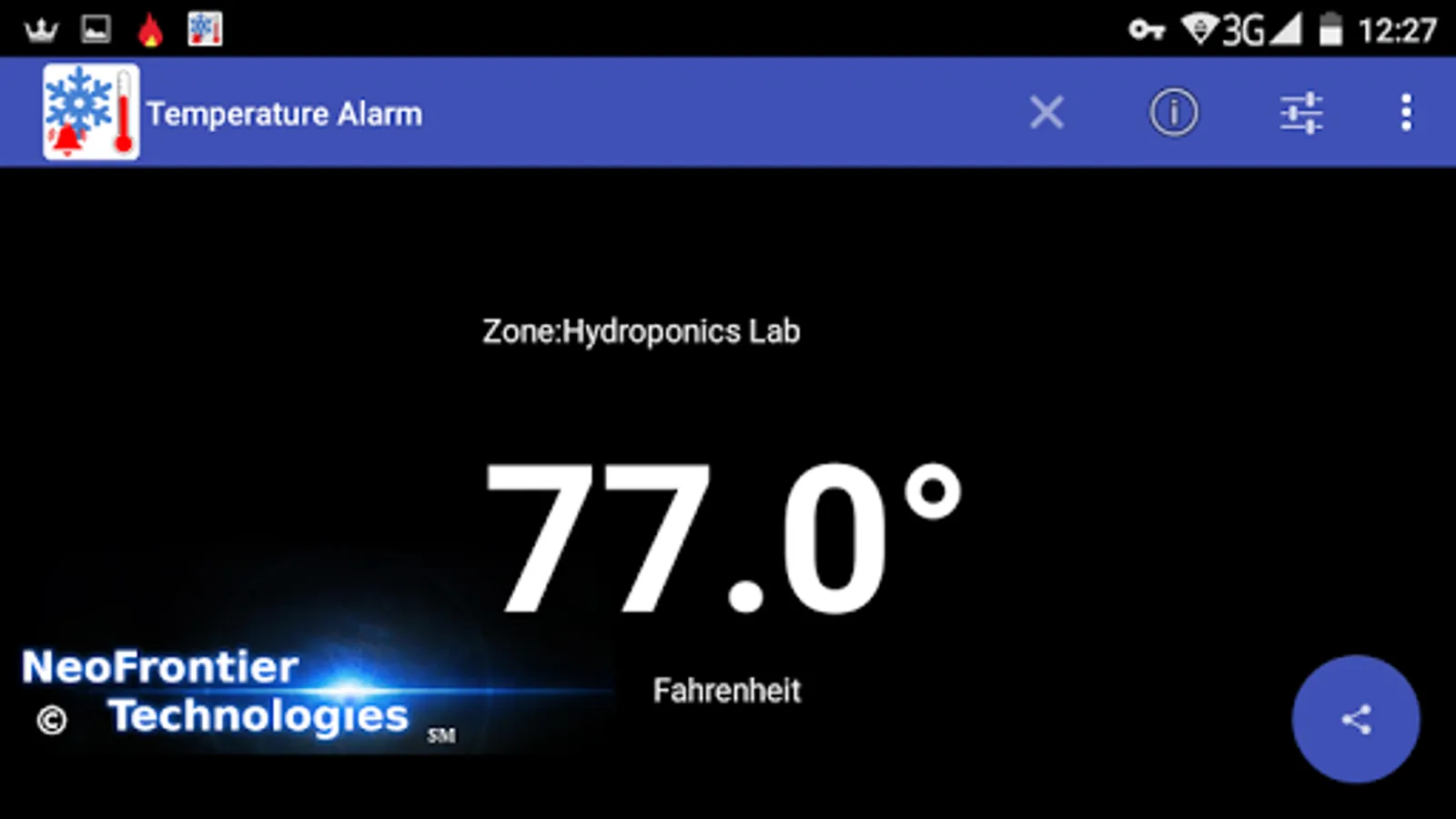 This Android application is used to monitor the temperature of a room like a server room, Hydroponics lab, greenhouse or outside in a crop field. Anywhere you need to monitor temperature. The app will dial a number or sound an alarm if the temperature reaches user specified levels. It can be used as a frost alarm alert system. Or as an overheat alarm. The length of time it will dial can be set to a specified amount of seconds. No billing needs to occur that way, it will only dial and then hang up after x amount of seconds. It will also give a battery low alert at a specified level.