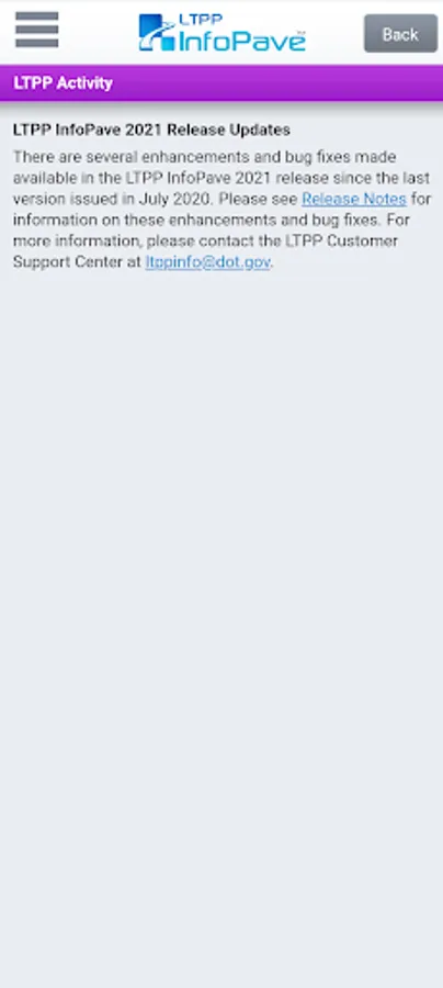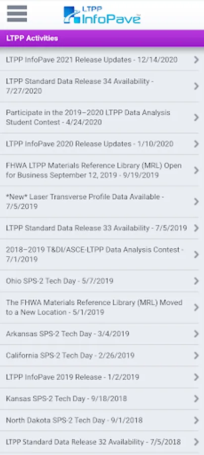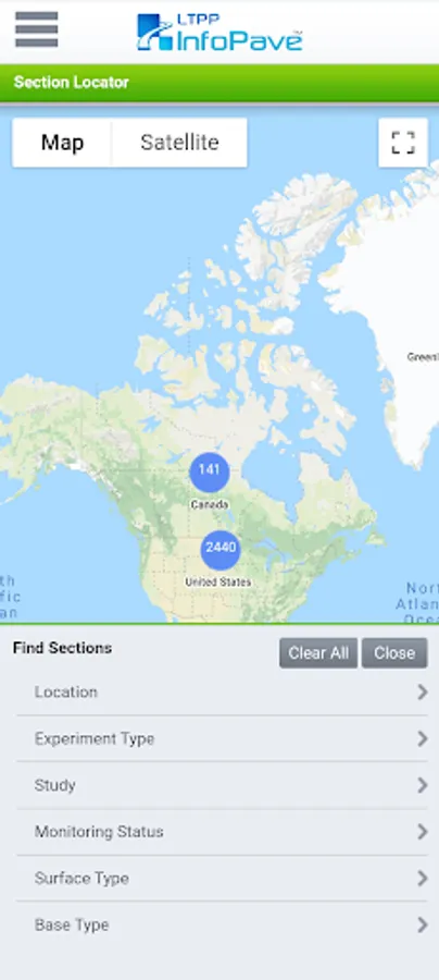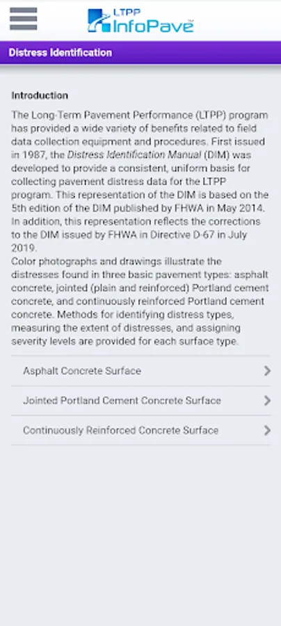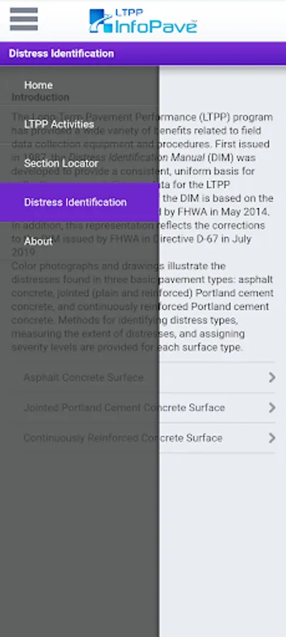 LTPP InfoPave Mobile, a LTPP InfoPave (https://infopave.fhwa.dot.gov/) companion application, provides fast and easy means of mapping the Federal Highway Administration (FHWA) Long-Term Pavement Performance (LTPP) test sections. It provides visual navigation using GIS map. It offers advanced section selection capability and detailed section information. Other features include LTPP program announcements and easy access to the LTPP Distress Identification Manual.