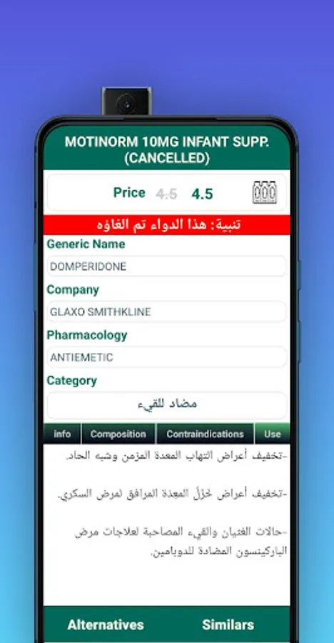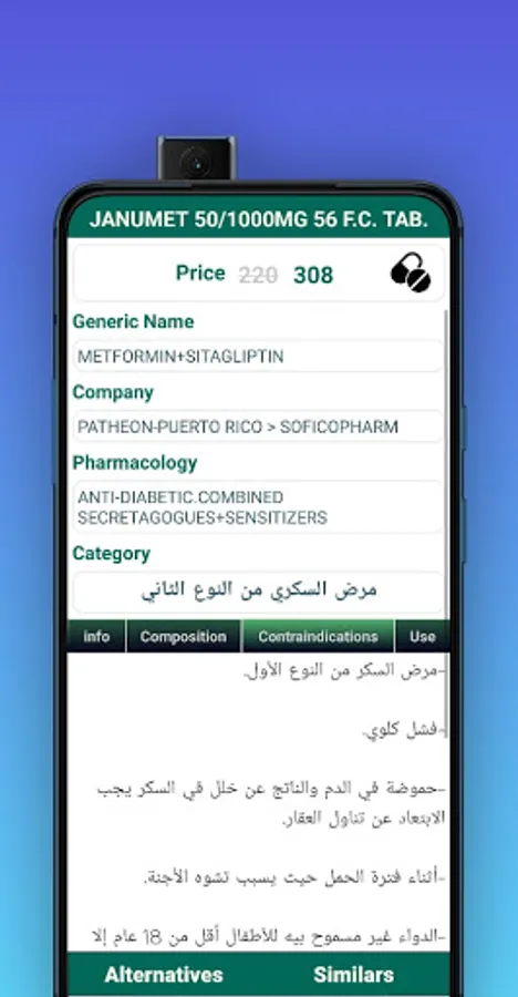 With the largest database of drugs in both Arabic and English in the Middle East, where the database contains more than 16 thousand medicines with the trade name, scientific name, pharmacology, company producing and price type, indications and contraindications.
