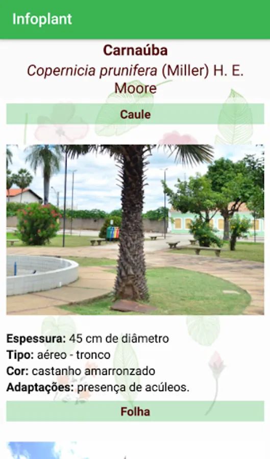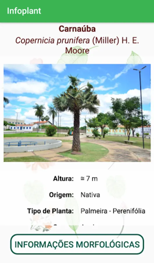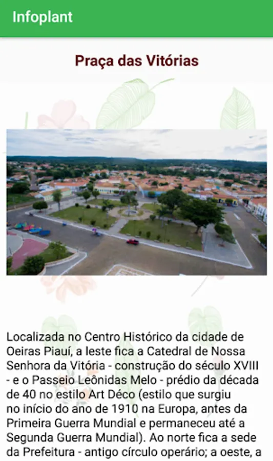 Infoplant is an educational plant catalog application, it describes all the plants studied in public squares in the city of Oeiras-Piauí. The application has in its original layout the theme of Botany and the local historical context. Displays botanical, historical information, curiosities and suggestions for activities for Biology teachers. It has the technology of quick response code (QR Code), which can be easily read by most modern cell phones through your camera. The use of the QR Code in the application is done through the digitization of the codes present in each plant of the studied spaces. After the user opens the code, it will be directed to the information screen of the scanned plan. Therefore, the App in question meets the needs of students, teachers, tourists and society in general.