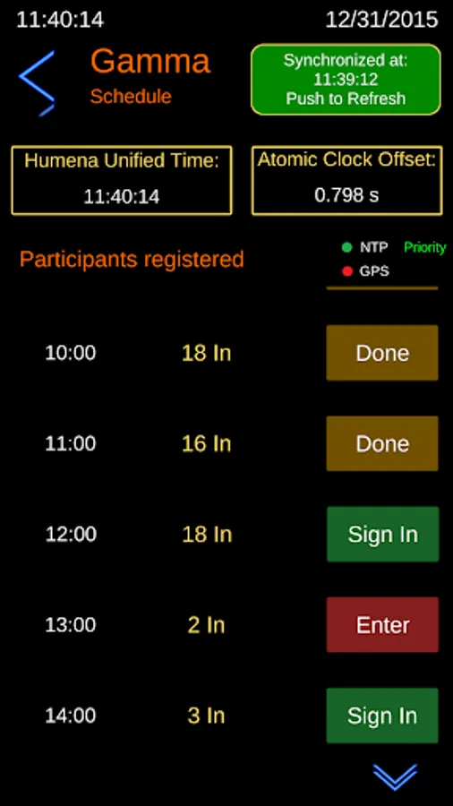 If using GPS, one must be in an open area to have accurate synchronization results. You only need to be in an open area during application's "synchronization in process" status. By clicking "Schedule", synchronization process will start. After synchronization completes, you may purchase a session on the time you would like to synchronously meditate with other users (clicking the Sign In button will bring a confirmation window). Once you click "Enter", you will see a red button that can be clicked 2 minutes before session start. Once you click that button, synchronous meditation will start after countdown and a boom signal. You can also re-synchronize and view additional participants who signed in with you at any time you want before session start.