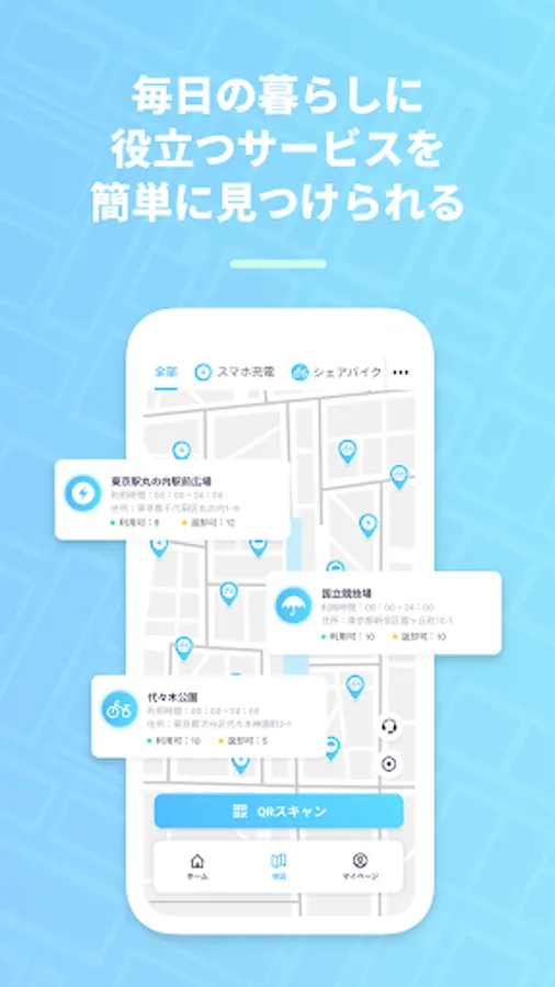 Services useful for daily life are displayed on the map. Reservations and rentals can be made directly at each spot (place)!