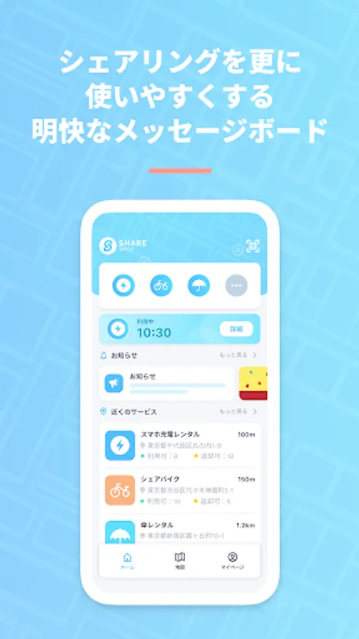 Recommended nearby services, services that can be used with ShareSPOT, recommended SPOTs, and useful information for sharing!