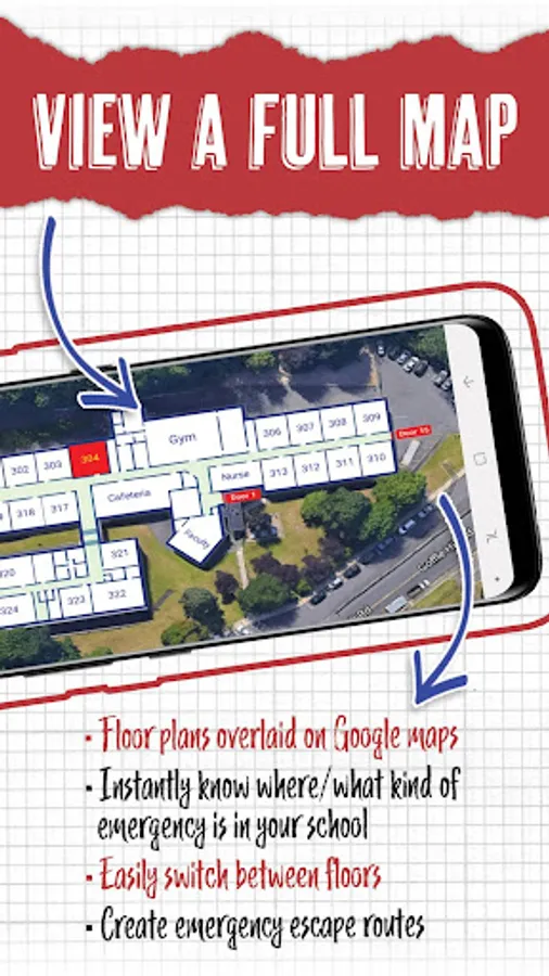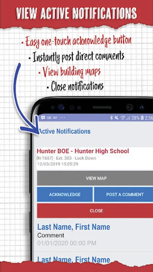 Receive real-time emergency notifications from lockdowns to medical emergencies. Be able to view and leave comments for all personnel. Use the one-touch acknowledge button to inform the group you seen and reviewed the notification. Click the “View Map” to see floor plans of your school, get the visuals on the emergency, easily switch between floors, and see emergency escape routes.