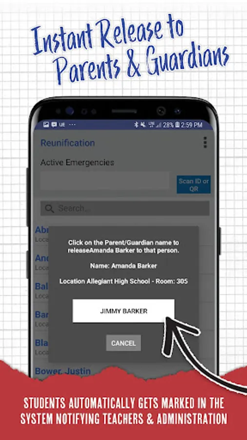 Easily reunite your students with parents/guardians during dire evacuations. District-wide notifications will be sent to parents/guardians with the location and time to pick up their child(ren). Quickly search and release each student saving time and unnecessary confusion.