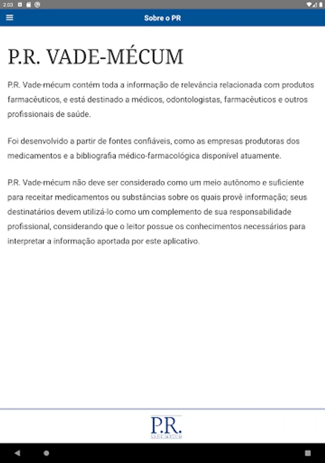 PR Vade-mécum should not be considered as a self-sufficient and sufficient means to prescribe medications or substitions on os quais provê informação; seus destinatários devem use it as a complement to your responsabilidade profissional, considering that or leitor possui os necessary conhecimentos to interpret the information provided by this application.