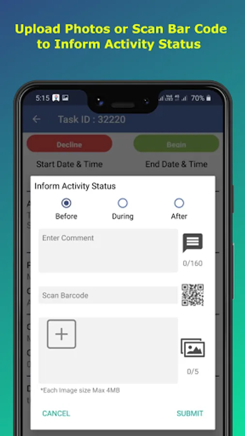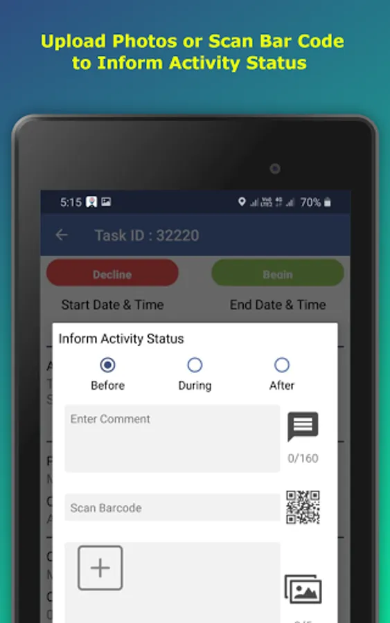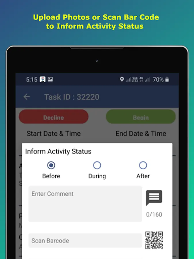 • Update each tasks status (Started, Paused, Resumed, Finished and Declined)