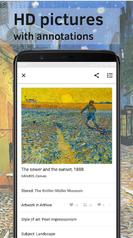 The Van Gogh app is an extensive guide to life and work of the great artist compiled by Arthive experts. The app includes information that is more complete than most encyclopedias and more precisely than any online gallery.