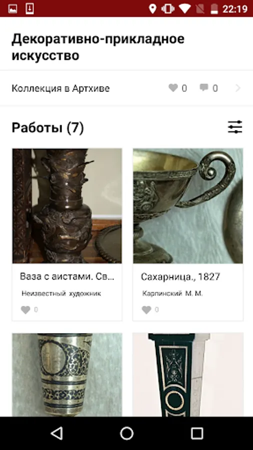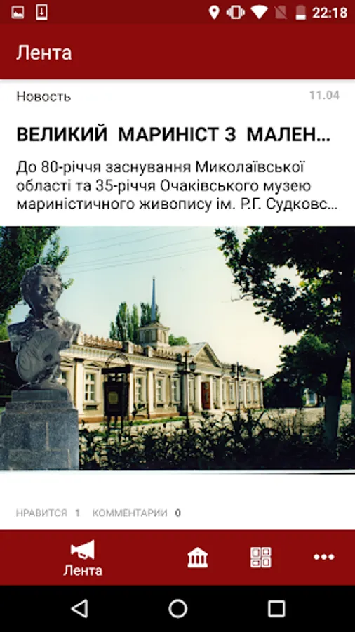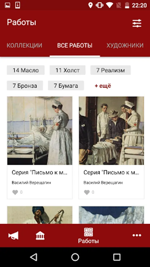 The main application screen - familiar to social networks tape. We add to the collection, sharing stories, announce exhibitions of new artists and other museum events, and you will immediately know about it.