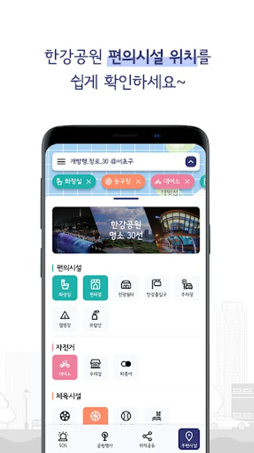 3) Check the location of convenience facilities such as restrooms, convenience stores, and bicycle rentals!